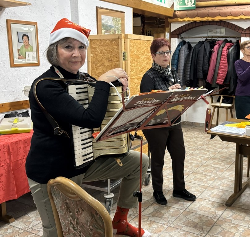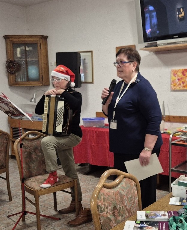 Vor dem reichlichen und leckeren Mittagessen vom Buffet hat jeder Teilnehmende eine Losnummer gezogen. Nach dem Mittagessen wurde es weihnachtlich. Mit Unterstützung unseres Kollegen Norbert Olk und seiner Gitarre sangen wir im Leinenhof althergebrachte, gemeinfreie Weihnachtslieder. Im Pappelhof übernahm dies unsere Kollegin Heike Baasch mit dem Akkordeon. Sie wurde von den Anwesenden mit verschiedenen Rhythmus-Instrumenten aktiv unterstützt. Der Mitmacheffekt hat die Stimmung gesteigert und allen sehr gut gefallen. Auch Weihnachtsgedichte und -geschichten wurden vorgetragen. Rainer Berg hat den Nikolaus vertreten und mit seinen drei Nikolaus-Helfern die Präsente aus dem Nikolaus-Postsack an die Seniorinnen und Senioren mit der entsprechenden Losnummer verteilt. Die Präsente wurden vom Betreuungswerk, dem SBR, der ver.di-BeG, der VPV, der PSD-Bank-West, der GUV-Fakulta sowie von Teilnehmerinnen und Teilnehmern gespendet.