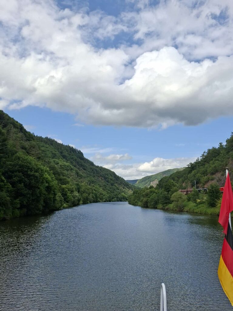 Nach dem Mittagessen in verschieden Restaurants ging es zu einer Schiffstour von Mettlach nach Saarburg. Hier beeindruckten das landschaftlich reizvolle enge Saartal mit seinen roten Felsen, die „kleine Saarschleife bei Hamm“ und der herrliche Blick auf die Klause Kastel, die am Sandsteinfelsen hoch über dem Saartal thront. Die Fahrt durch die Staustufe Serrig war ein weiteres Highlight. In Saarburg mit seiner imposanten Burg endete die Schiffstour und nach einem kurzen Fußweg zum Bahnhof Saarburg traten wir die Rückreise zu den Ausgangsbahnhöfen an.