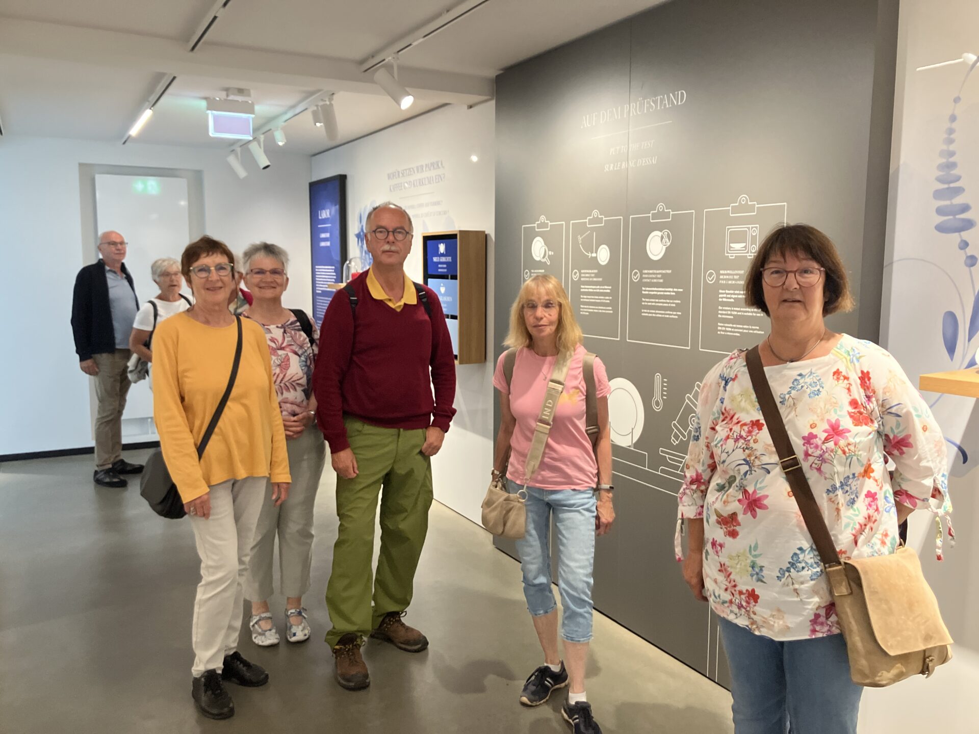 Mit dem Zug fuhren 56 Teilnehmer zu unserer Tagesfahrt am 26.Juni 2025 und haben die Villeroy&Boch Welt hautnah entdeckt. Bei der interaktiven Ausstellung am Unternehmenssitz in der Alten Abtei in Mettlach konnten wir Innovation und über 275 Jahre Firmengeschichte auf über 2.000 qm erleben. Wir betraten die Ausstellung durch den historischen Milchladen, der mit rd. 15.000 handdekorierten Fliesen geschmückt ist. Danach folgten mehrere Stationen, in denen wir sehen konnten, wie die Porzellan- und Keramikprodukte entstehen, aber auch wie sich das Keramikdesign im Laufe der Jahre verändert hat. Schwerpunkt der Ausstellung sind das Geschirr aus Steingut und Porzellan, sowie die Baukeramik mit den Mettlacher Platten, Boden- und Wandfliesen. Daneben ist die Geschichte der Familien Boch und Villeroy dargestellt.